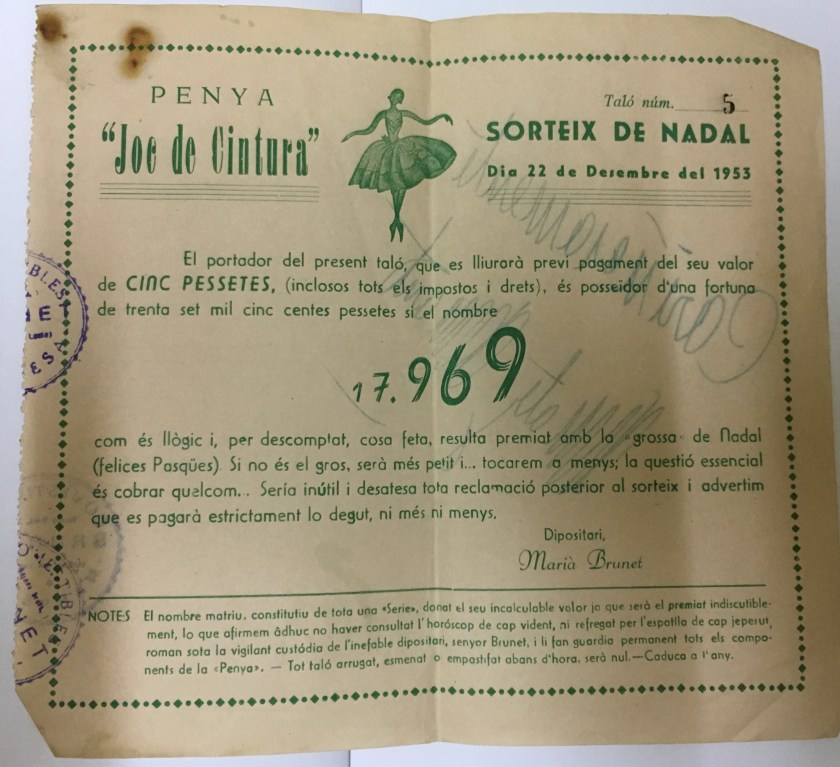 El 1953, la penya del Joc de cintura va comprar una sèrie del número 17.969 de la loteria de Nadal. Va vendre’l en participacions de cinc pessetes. El text que hi van imprimir és un bon testimoni del bon humor que gastaven els membres del grup: